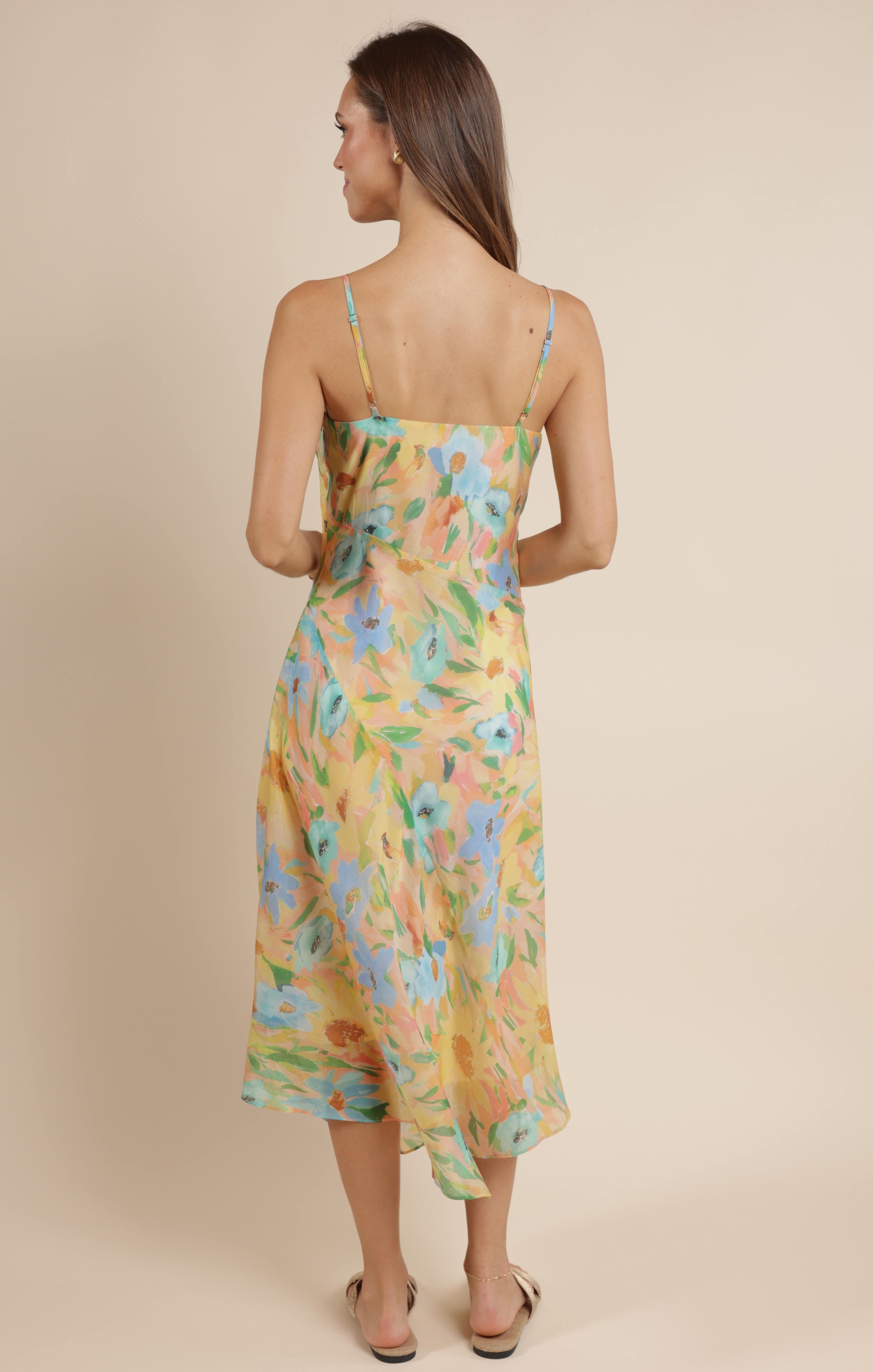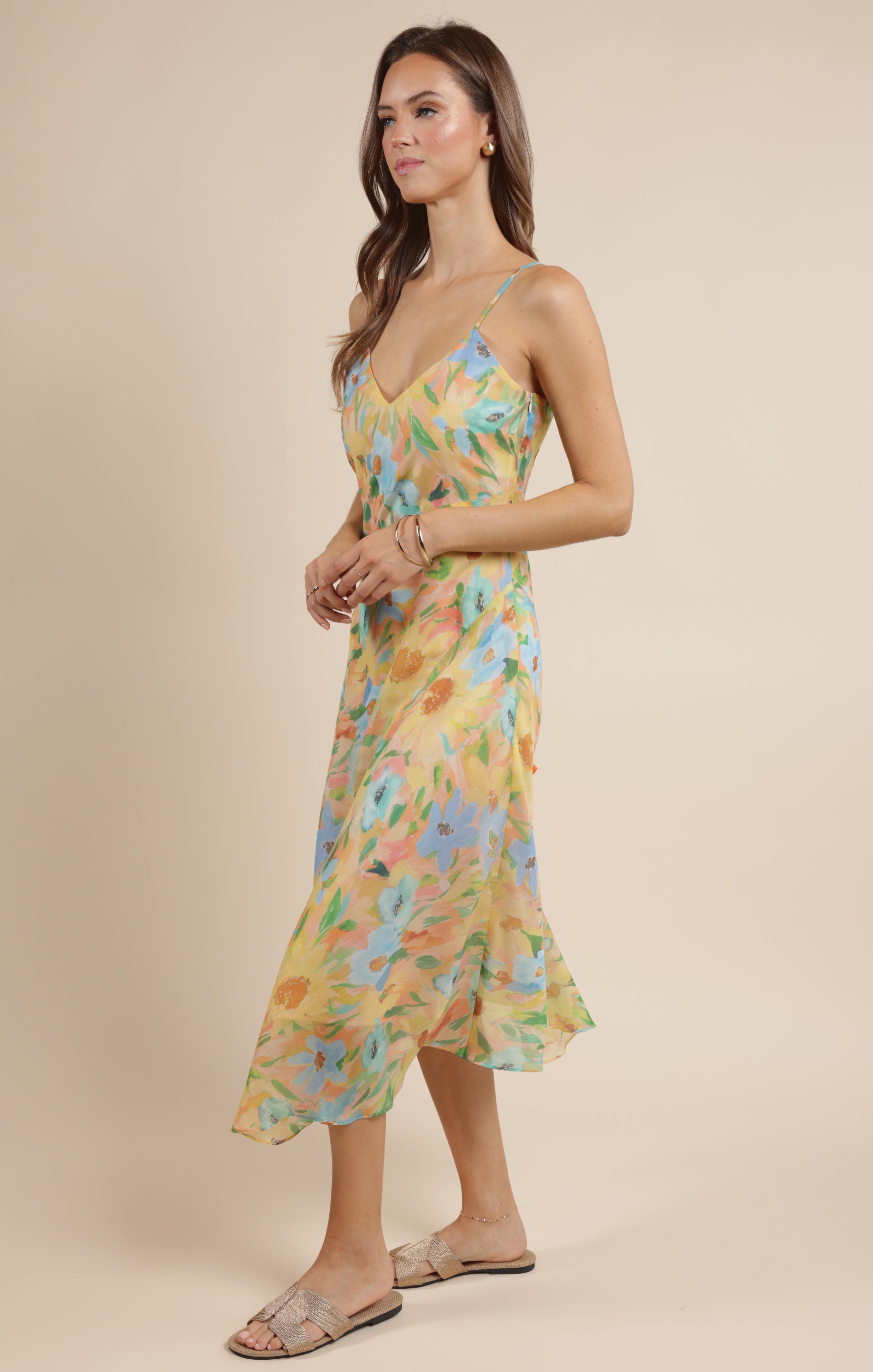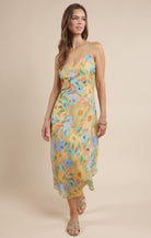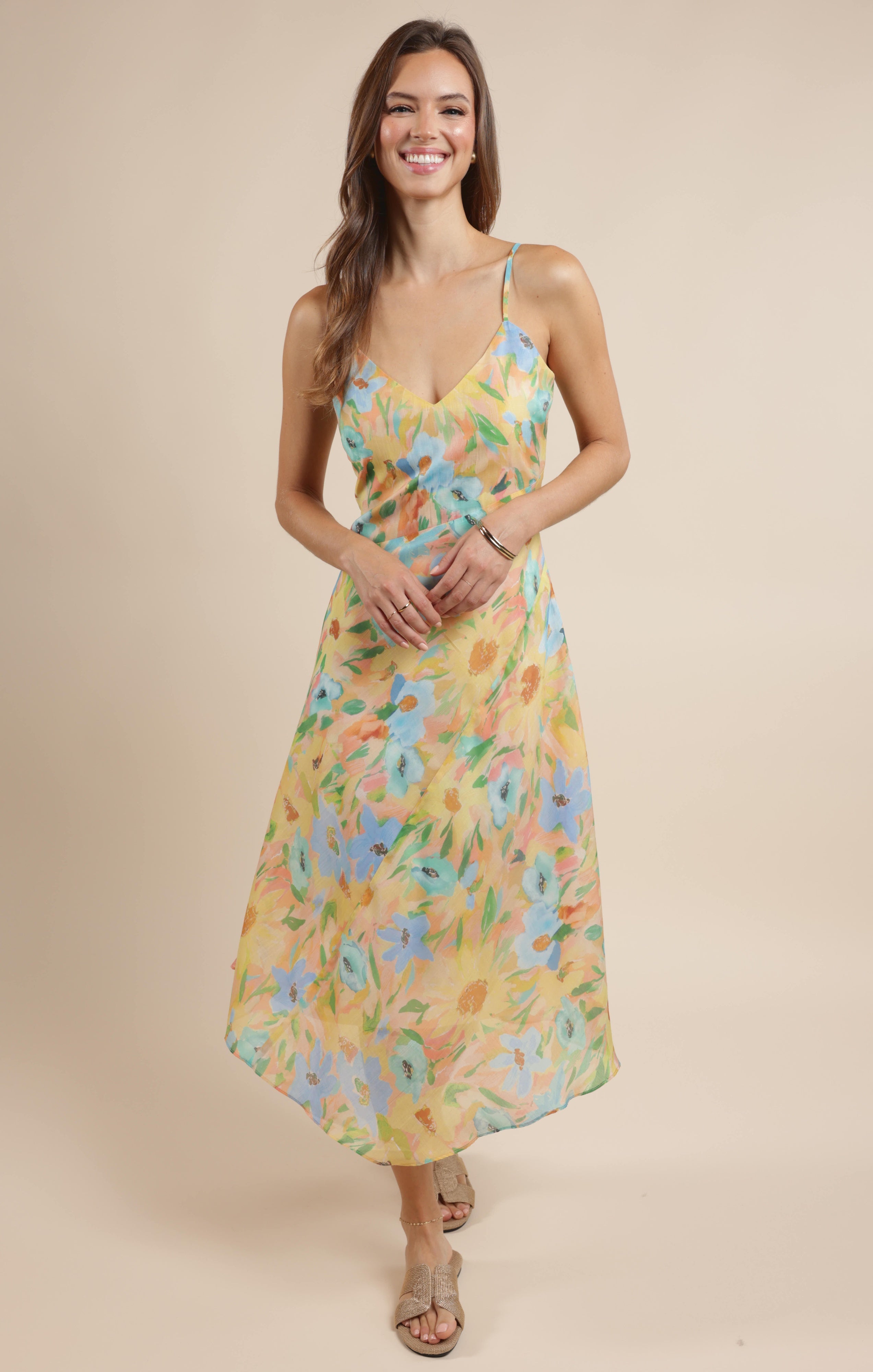 Introducing our Daisy Chain Dress - a flowy, sleeveless maxi dress with a vibrant yellow and multi-colored floral pattern. Perfect for any occasion, this dress will make you stand out in the crowd with its playful and colorful design. The V neck adds a touch of elegance, while the maxi length ensures comfort and coverage. Don't be afraid to add some fun to your wardrobe with this unique piece!