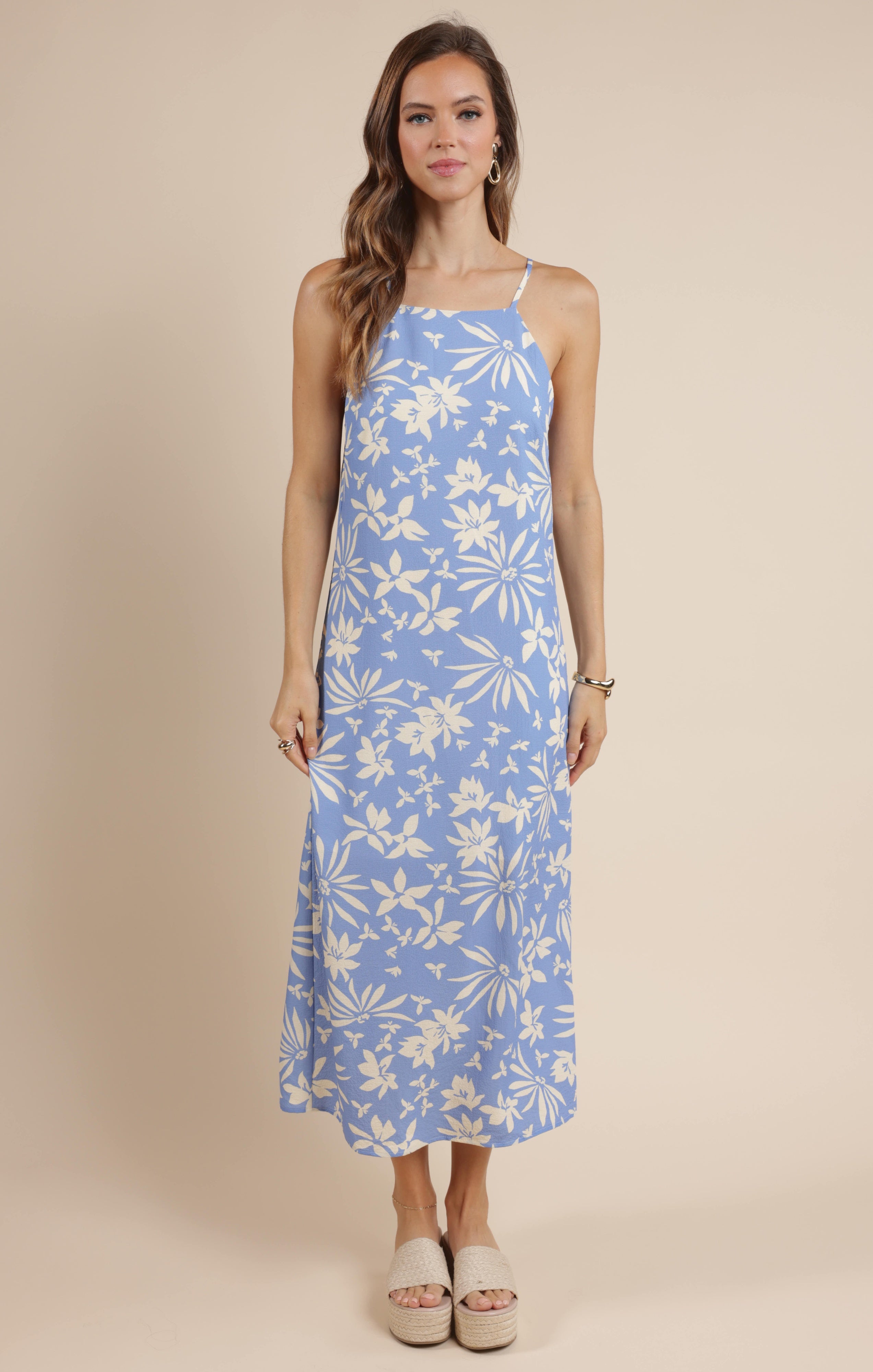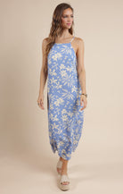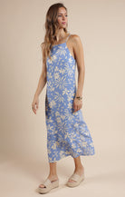 Get ready to bloom in style with our Flower Trail Dress! This sky blue and cream beauty features a sleeveless design, square neckline, and maxi length for a effortlessly chic look. Fully lined and fitted for a flattering silhouette. Add this to your wardrobe for a touch of floral fun!