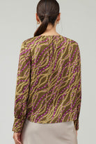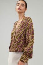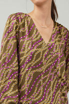 The Augustus Top is a feminine long sleeved blouse in a beautiful color mix of olive and wine! This top features a flattering v-neckline, a surplus top, a button front, and an abstract print. This top will definitely make a statement in the workplace!