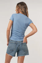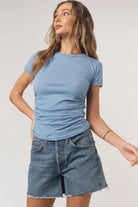Is this the best tee you'll wear all week? Definitely. The Izzie Ruched Baby Tee features a shrunken, fitted silhouette made in a soft, heathered, jersey fabric. The classic tee style with a crew neckline and short sleeves is made even better with feminine and flattering side ruching. Our fave way to style a baby tee this season? With a pair of boxer shorts and loafers, of course.
