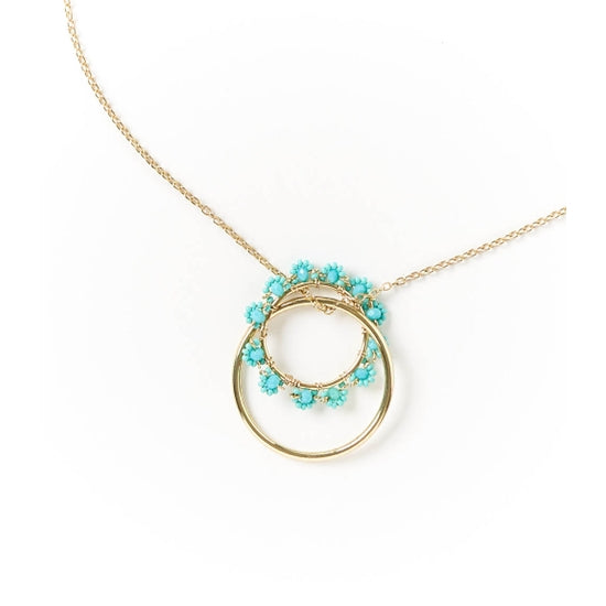 Our Jatasya Collection combines traditional techniques of beading and jewelry making art forms in alluring, modern, teal and gold designs. This handcrafted hoops pendant necklace features one shiny gold finish hoop and one gold finish hoop wire wrapped with faceted turquoise glass seed beads fringe. Glass seed beads are skillfully interwoven by master artisans in New Delhi to achieve this refined design, a rich expression of age-old, ornate design motifs.