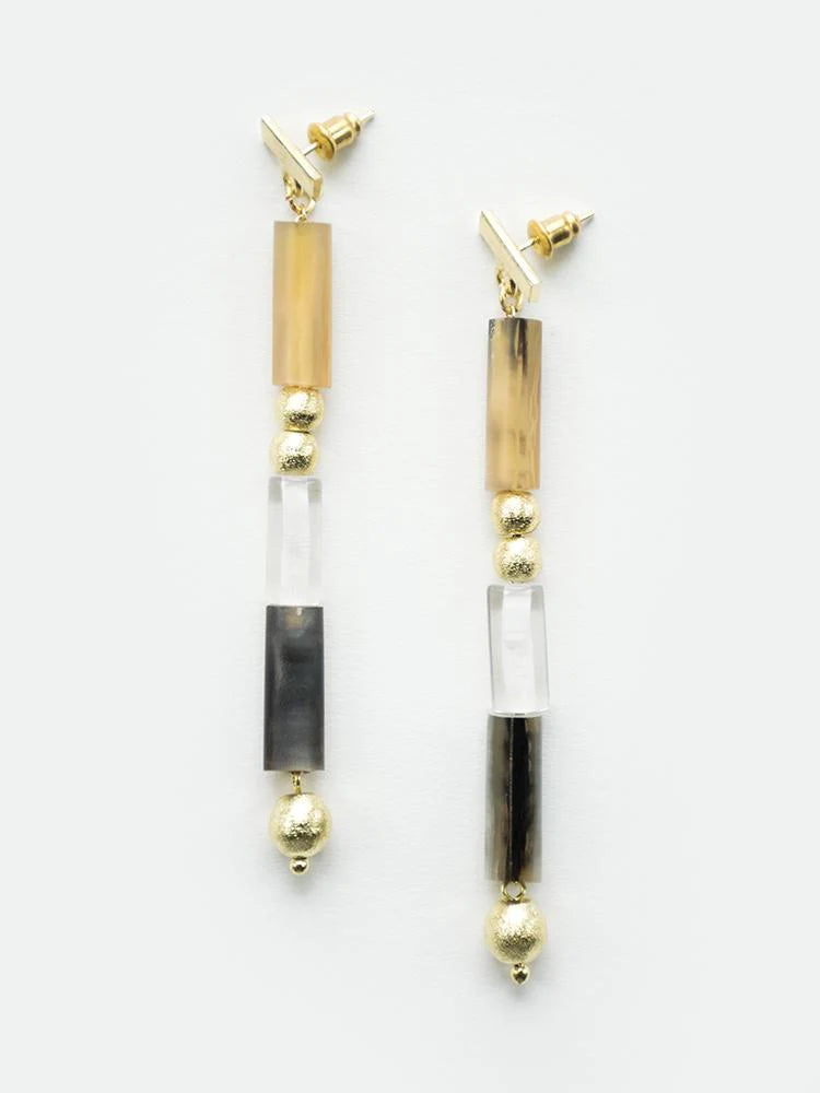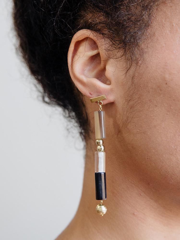 These modern earrings are stacked with upcycled horn, brass, and resin pieces. Pair them with a smokey grey blouse, washed denim and wooden block heels.