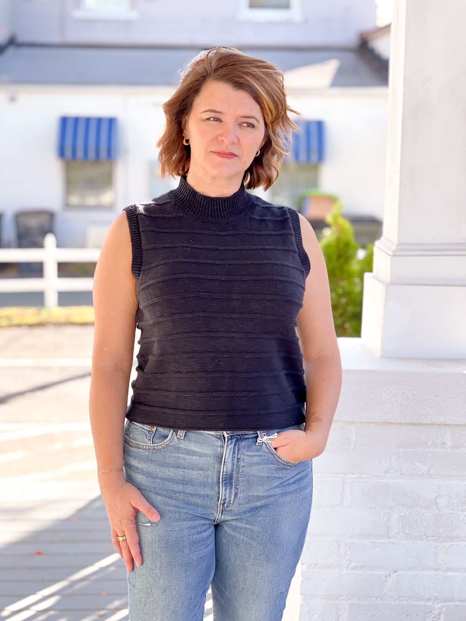 Your life will become easier with the Life Is Easy Tank in it! This fitted, mock neckline sweater is perfect for one of those warm fall days when you still want to wear a sweater but without the sleeves. You can also throw on a denim jacket over this tank on a cold day!