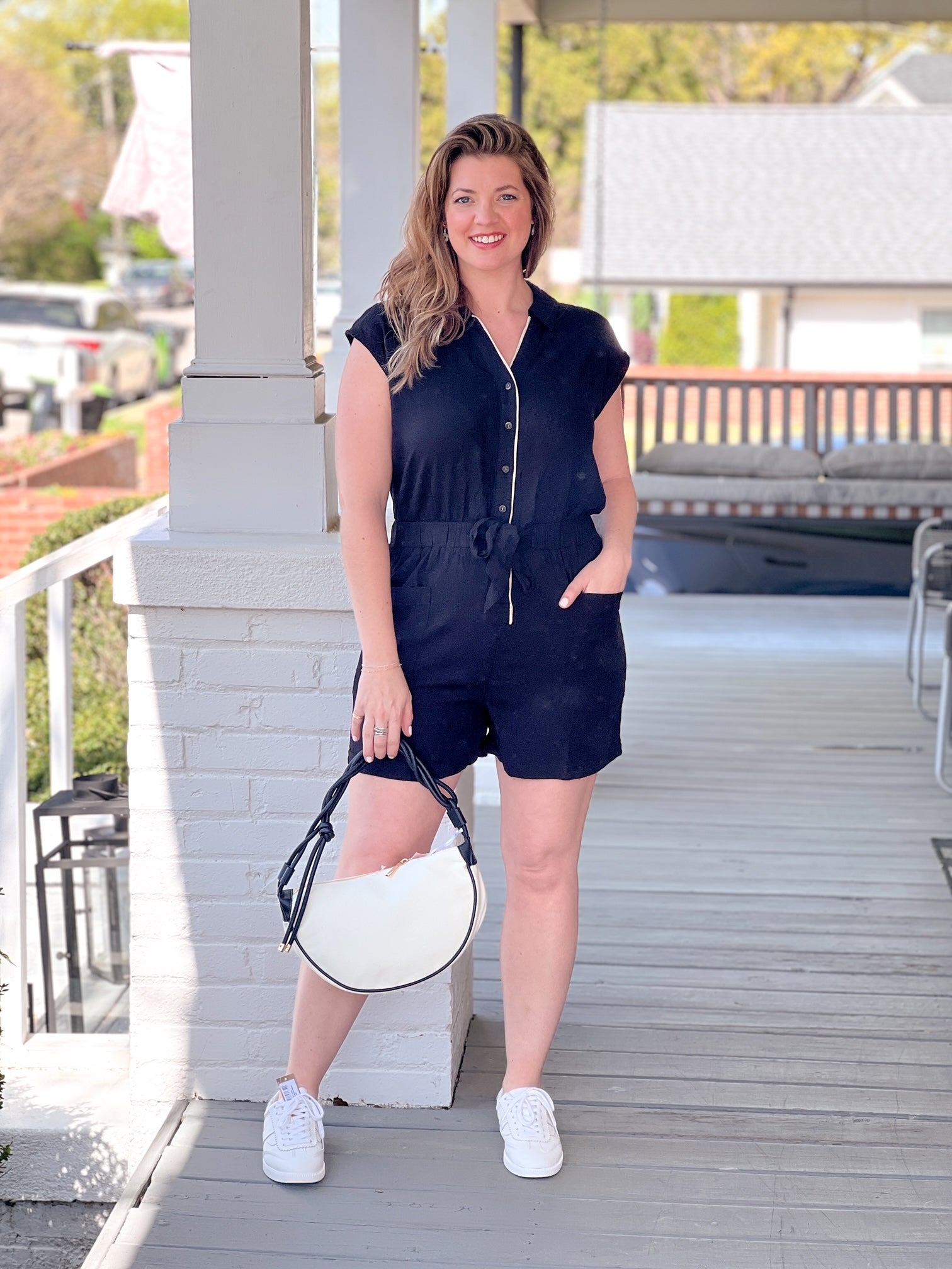So easy, one-and-done outfit with this wear-anywhere romper, featuring an elastic waist with tie, cap sleeves and contrast button front piping.