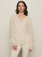 Soft, romantic, and effortlessly wearable, the Meilani Top is a beautiful addition to your everyday wardrobe. This lightweight blouse features a flattering v-neckline and a button-front design for easy styling. Ruffled sleeves and a ruffled hemline add feminine charm, while the relaxed fit keeps it comfortable and breezy from day to night.