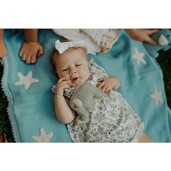 This adorable elephant rattle is as soft as butter and gentle as rain. Handmade with organic cotton yarn, the rattle inside gives a gentle jingle when shaken. Perfect for tiny hands to hold and love.