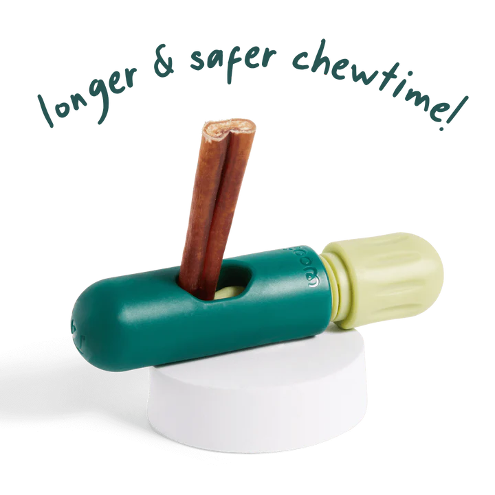 The BullySafe offers peace of mind by promoting proper chewing, making each treat last longer for more enjoyment (and bully stick savings!). It’s crafted from tough, non-toxic nylon to withstand even the most serious chewers, so pups can enjoy their chews without the risk of choking or swallowing big pieces. The easy-to-use, adjustable design fits chews of all sizes, and it’s a perfect fit with grass-fed, free-range Woof Bully Sticks.
