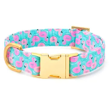 Your pup will look laid back and ready for summer with this adorable collar featuring flamingo floaties against a pool blue background.
