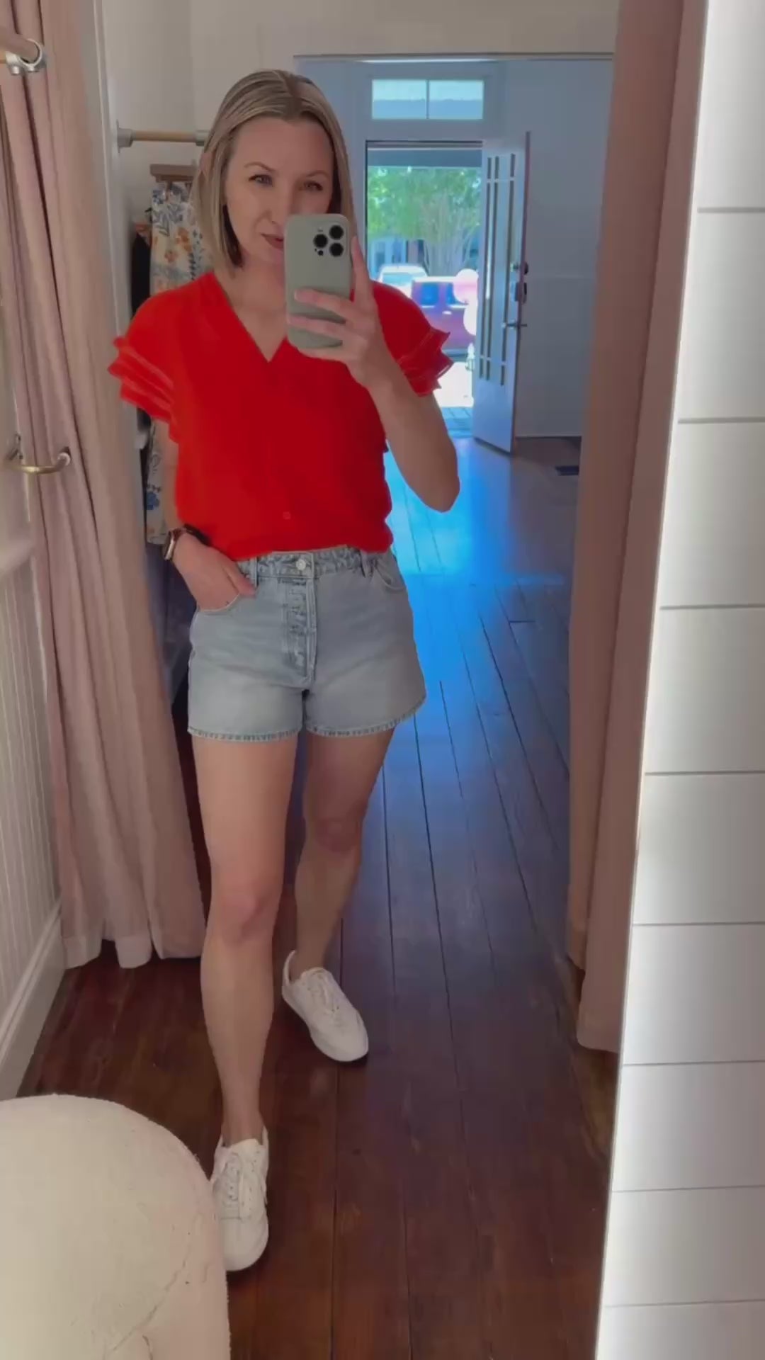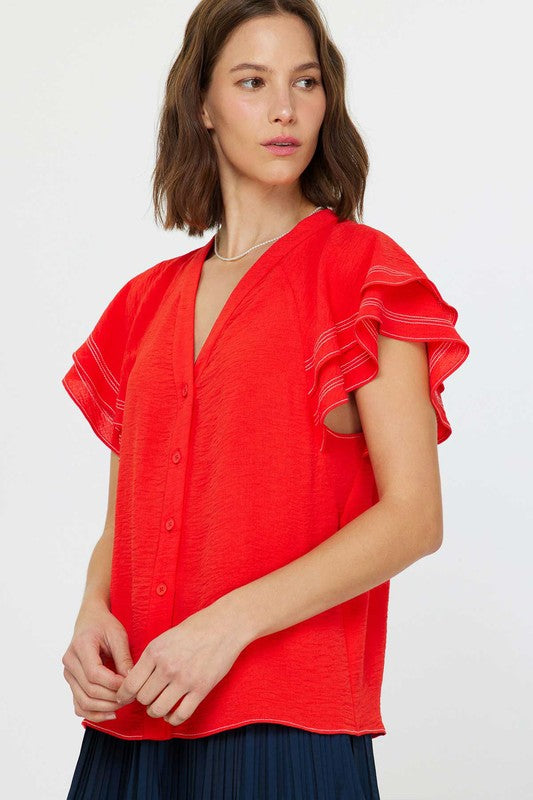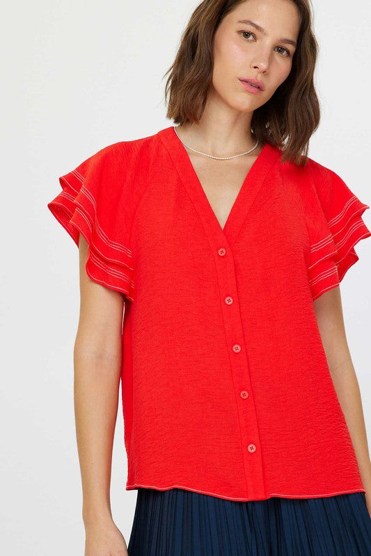 The Thea Top is a beautiful red short sleeve top that will be sure to stun! This top features a v-neckline, a button front closure, and double layered flutter sleeves. Pair this top with your favorite work pants and heels!